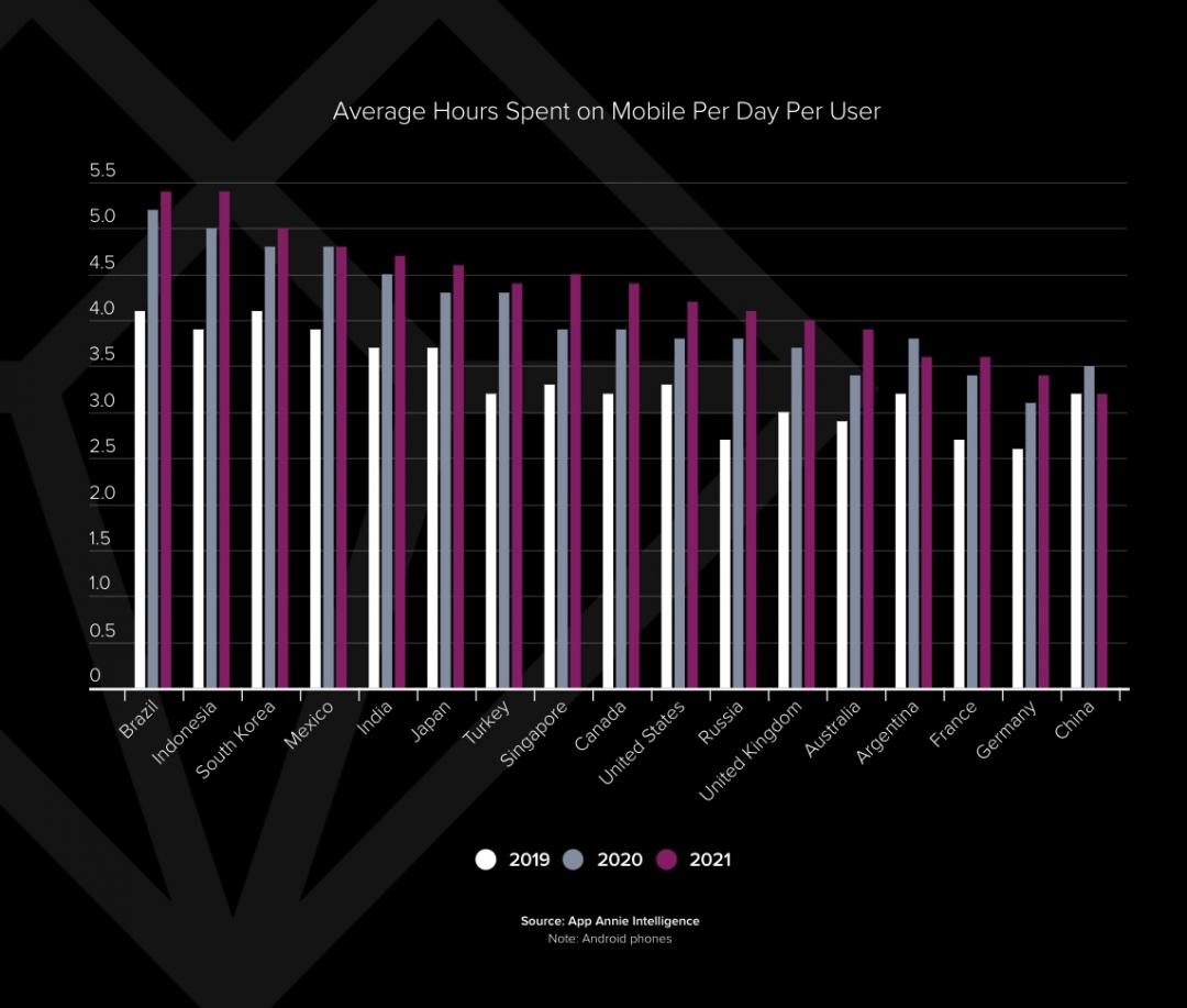 以「App使用時間」來說,全球排名前十大的行動應用市場,用戶平均一天花在滑手機App的時間約近4個小時48分鐘,比2019年高出30%。觀察來自全球17個國家的數據統計,總計2021年度這一年花在應用程式的時間長度達5小時以上的國家,包括有:巴西、印尼與韓國,這三個國家的行動用戶在使用手機或平板裝置上,滑App的時間長度都高於全球平均4.8小時。