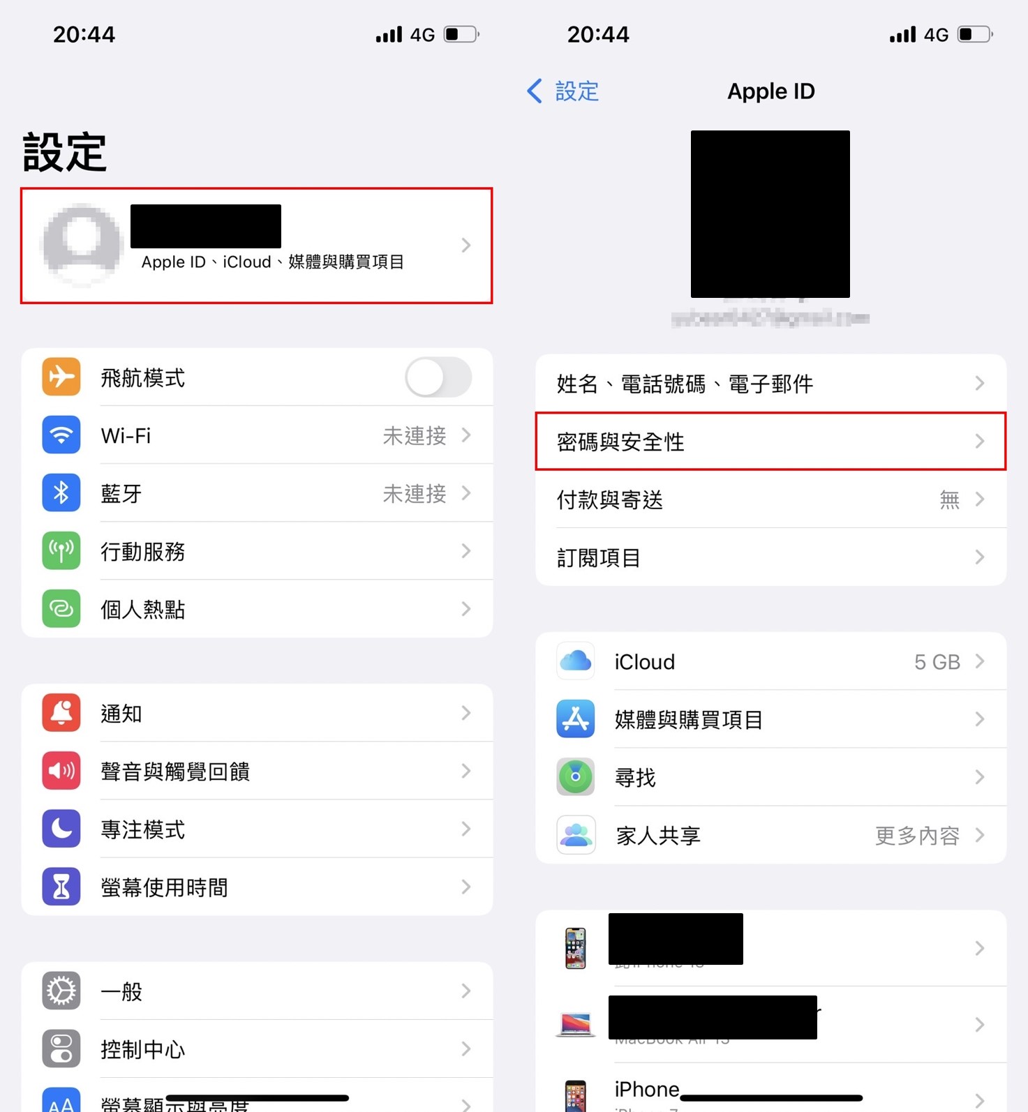 1、「設定」➝「Apple ID 帳號」➝「密碼與安全性」